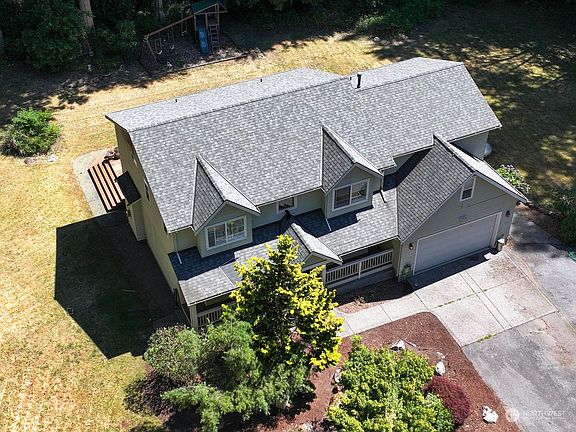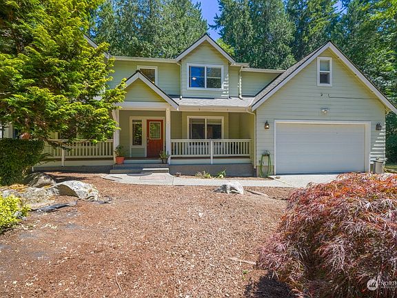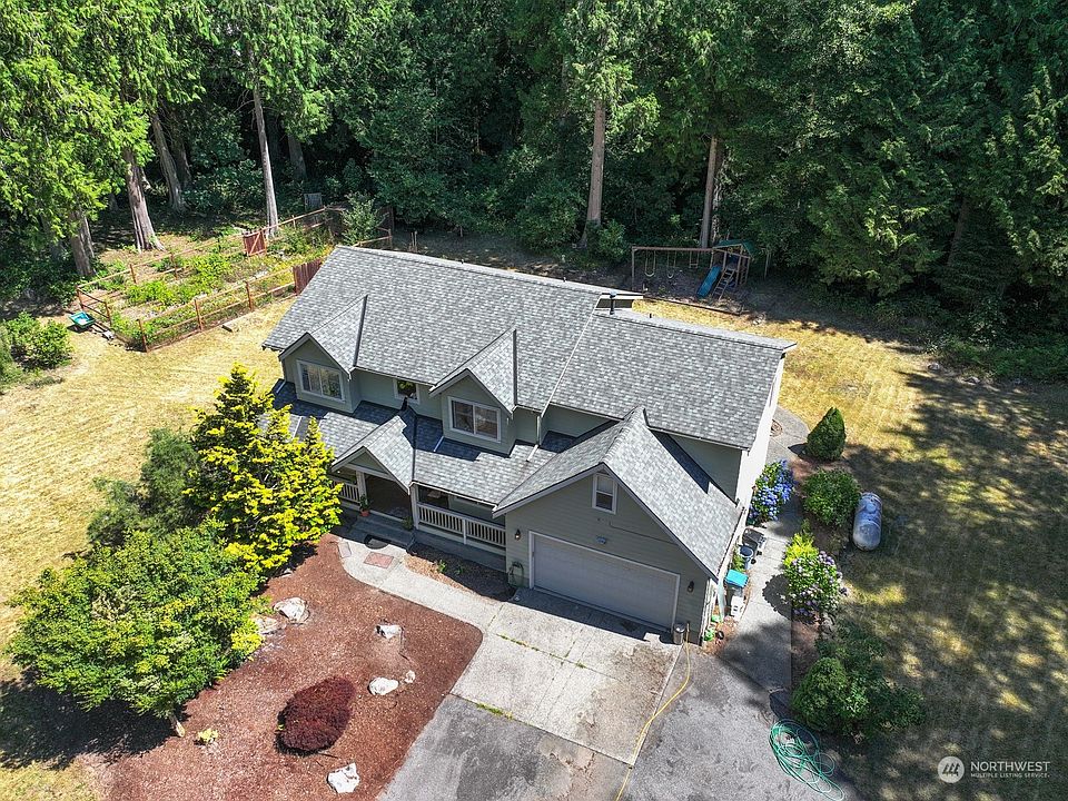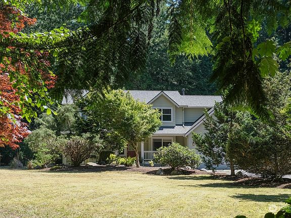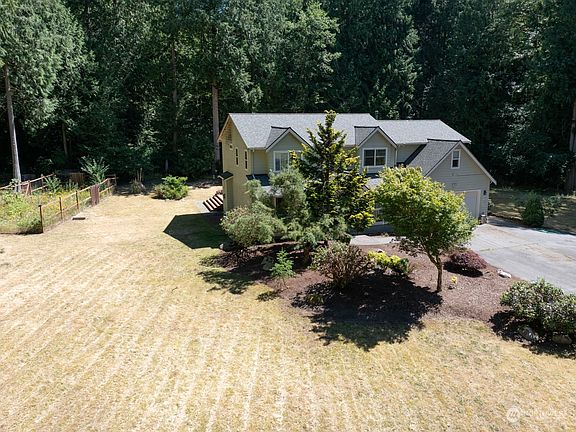 Just 5 minutes from the Agate Pass Bridge lies the large lot subdivision of Sol Bakken, featuring 32+\- parcels ranging from 2 to 5 acres. On a 2+ acre parcel is the, Castlewood Builders build a 2800+ sq ft home with 3 bedrooms and 2.5 baths (4-bedroom septic). Upon entering this woodland-surrounded property, you are welcomed by expansive lawns flanking the circular driveway and garden spaces. The lawn edges include a fenced garden area, a designated playground, garden shed with "garage" style door, and a dog enclosure. The broad covered front porch spans the front of the home, leading you inside where the upper level offers additional bedrooms and bathrooms, along with a large bonus room and an adjacent smaller room perfect for an office.