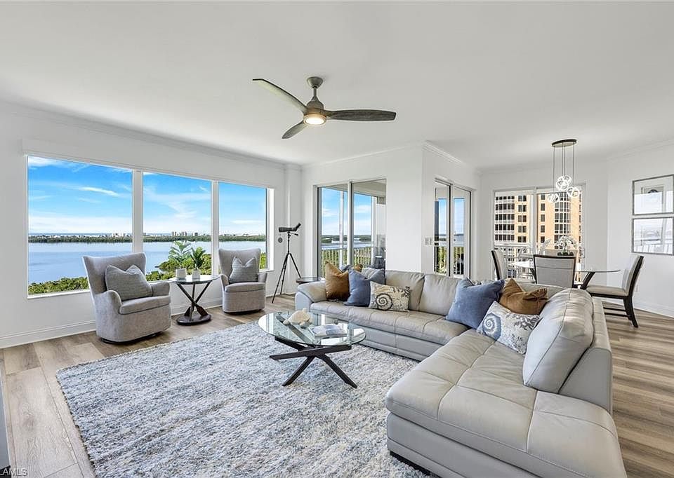 Stunning views and exceptional lifestyle await in Vistas #1103, a beautifully maintained and recently reimagined residence in one of Bonita Bay's signature high rise communities. With over $200,000.00 in upgrades, you will feel like you are living in a resort every day! Upgrades include a newly resigned open-concept kitchen, waterfall quartz countertops, crown molding with accent lighting both on ceiling and undercabinet, reverse osmosis water system, new flooring through entire unit (no carpet), and updated bathrooms. With over 2500 square feet of living space and three bedrooms (one is used as an office), there is plenty of flexible space to make this your own special home. What truly sets this residence apart are the three outdoor lanais (one large screened and two unscreened off the bedrooms) lending themselves to watching beautiful morning sunrises and sunsets. The Vistas offers on-site management, two guest suites, social room, gorgeous pool and spa, fitness center and recently refreshed common areas. Set within the award-winning Bonita Bay, residents enjoy 12+ miles of trails, 3 parks, kayak launch, full-service marina with dry-dock storage and a private two-story Gulf-front beach park with shuttle service. Membership to the award-winning Bonita Bay Club is optional, providing access to five world-class golf courses, tennis, pickleball, croquet, luxury spa and fitness, and multiple dining venues. This is move-in ready luxury with unmatched amenities-this is the Southwest Florida lifestyle at its best.