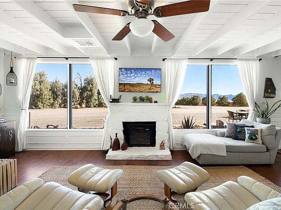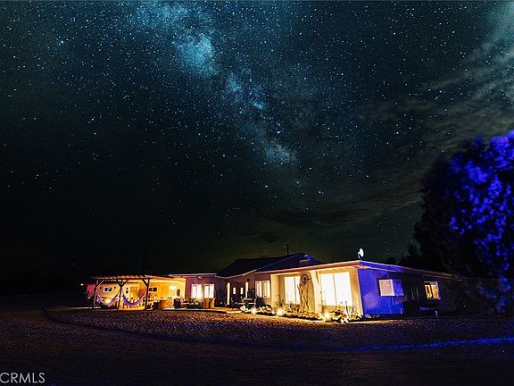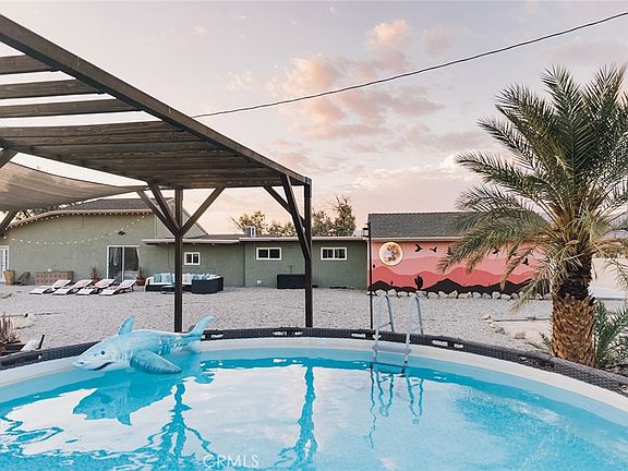 Escape to a private, resort-style compound with stunning views and designer touches. This desert retreat spans a sprawling 5-acre property, fully fenced and once featured on TV’s Staycation (KCBS/KCAL9) in June 2021. Surrounded by 150 fully mature trees on irrigation, the home offers exceptional privacy and natural beauty, perfect for star-gazing and serene getaways. Located just 20 minutes from the eastern entrance of Joshua Tree National Park and downtown Twentynine Palms, this property has been a successful Airbnb since 2019. It features three bedrooms, three full bathrooms, two living rooms, a dedicated TV room, a breakfast nook, and a large dining area seating 8-10, ideal for gatherings. The fully equipped kitchen is ready for any culinary adventure. Outdoors, enjoy shaded relaxation spaces with hammocks, a BBQ, and a cozy fire pit. The property also includes an above-ground pool and jacuzzi for year-round relaxation, all complemented by breathtaking 360-degree mountain views at dusk. Modern amenities include central air conditioning, Wi-Fi, and Smart TVs with streaming services. Whether as a vacation home, remote retreat, or investment property with Airbnb rental potential, this home combines modern luxury with desert serenity, making it the ultimate escape for those seeking privacy, beauty, and a unique desert lifestyle.