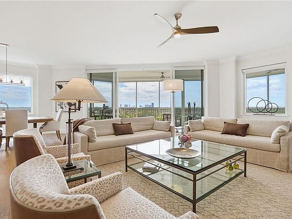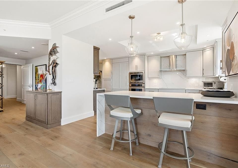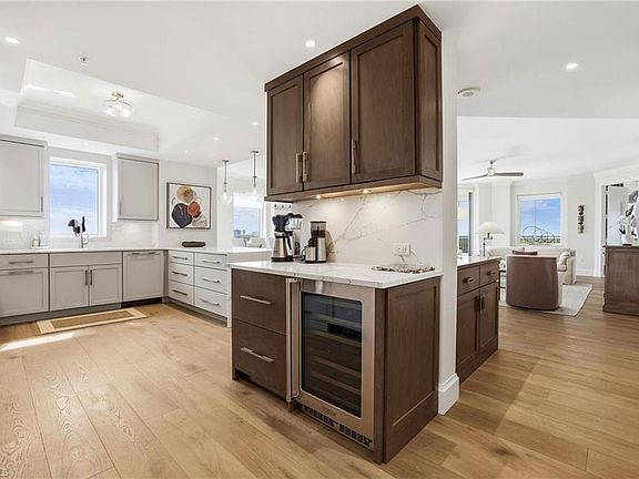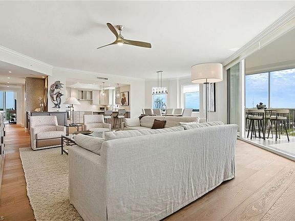 TRANSFERABLE GOLF MEMBERSHIP AVAILABLE….with this special one-of-a-kind residence on the South end of the South tower in Jasmine Bay. Enjoy complete privacy and stunning Southwestern golf course, lake, and Estero Bay views from this unique, totally renovated and reconfigured 3-bedroom end unit. The remastered chef’s kitchen features all new Thermador appliances, Brookwood cabinetry, pull out drawers, full pantry, Caesarstone Quartz countertops with waterfall edge, Richelieu hardware, Blanco sinks and separate built-in beverage station with wine cooler and refrigerator drawers. Additional designer highlights include naturally aged 8 ¾” La Jolla Oak hardwood floors throughout, elegant built-ins in the living room and office/guest bedroom, custom window treatments and modern high-end lighting and fans. All bathrooms boast Brookwood cabinetry, Hansgrohe plumbing fixtures, Toto toilets, and Kohler sinks. The spectacular primary suite offers custom closets, dual vanities and a massive walk-in shower with multiple heads and built-in seating. Relax on your two spacious lanais - an Eastern lanai for early morning sunrises and a 39-foot wrap-around Western lanai for tremendous nightly sunsets. Recent upgrades and conveniences include a new hot water heater, Electrolux washer and dryer, new electrical wiring, pot lights, and white Storm Smart motorized hurricane shutters. Jasmine Bay offers an array of resort-style amenities, including a fully equipped private gym, club room, card room, movie theater, and a stunning infinity-edge pool with hot tub. Enjoy outdoor relaxation in private poolside cabanas or take advantage of the gas grills located on the pool deck. The towers also offer four spacious guest suites perfect for overflow guests. West Bay Club amenities include a new private Beach Club on the Gulf of Mexico with a restaurant/bar, plus chair and towel service. The newly renovated Bay House offers a resort-style pool, yoga studio, Pilates, stretching, spinning room, sauna, Aqua Cafe poolside restaurant for indoor or poolside dining, 8 clay tennis courts, and a Technogym state-of-the-art fitness center. West Bay’s River Park is on the Estero River and features a fishing pier, boat launch w/Gulf access, boat storage, kayaks/canoes, playground, basketball court, picnic areas, and a 1.5-mile walking trail. The Sports Park offers residents 6 pickleball courts, a fitness lawn, bocce courts, and 2 separate dog parks. Memberships are also available to the private 18-hole Pete and PB Dye golf course and clubhouse.
