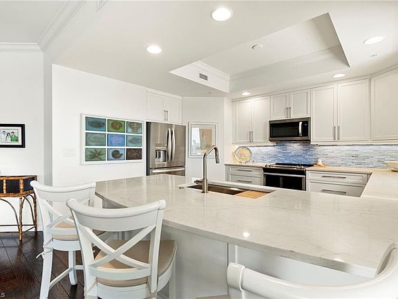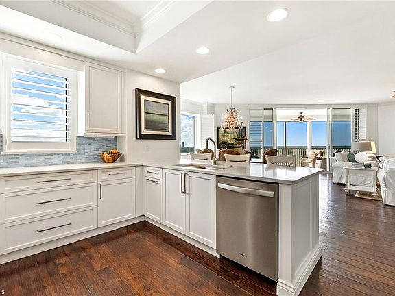 A fully transferable golf membership to West Bay Golf Club comes with this rarely available end unit on the South side of the Jasmine Bay South Tower! Enjoy spectacular sunsets and expansive views over Estero Bay and The Gulf of Mexico from the large wrap-around lanai of this 3 bedroom (all ensuite), 3 1/2 bath condo. This exquisite and masterfully updated residence features, private elevator entry, wood flooring throughout, plantation shutters, stainless steel appliances, new custom kitchen cabinets, quartz countertops, stylish tiled backsplash, and the convenience of electric hurricane shutters. The master suite boasts dual sinks, large shower, soaking tub, and the 2 ensuite guest bedrooms share a balcony overlooking the community ang golf club. Jasmine Bay offers an array of resort-style amenities, including a fully equipped private gym, club room, card room, movie theater, and a stunning infinity-edge pool with hot tub. Enjoy outdoor relaxation in private poolside cabanas or take advantage of the gas grills located on the pool deck. The towers also offer four spacious guest suites perfect for overflow guests. West Bay Club amenities include a new private Beach Club on the Gulf of Mexico with a restaurant/bar, plus chair and towel service. The newly renovated Bay House offers a resort-style pool, yoga studio, Pilates, stretching, spinning room, sauna, Aqua Cafe poolside restaurant for indoor or poolside dining, 8 clay tennis courts, and a Technogym state-of-the-art fitness center. West Bay’s River Park is on the Estero River and features a fishing pier, boat launch w/Gulf access, boat storage, kayaks/canoes, playground, basketball court, picnic areas, and a 1.5-mile walking trail. The Sports Park offers residents 6 pickleball courts, a fitness lawn, bocce courts, and 2 separate dog parks. Membership is also available to the private 18-hole Pete and PB Dye golf course and clubhouse.