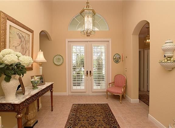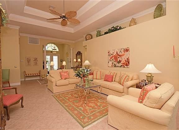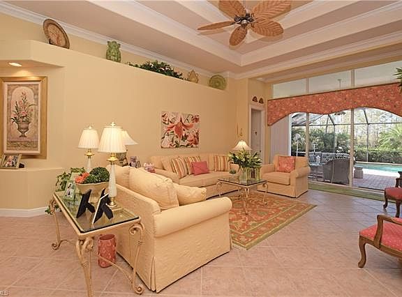PRICE REDUCTION.. FURNISHED PRISTINE single family, Saranac Collection model, 3 bedrooms plus den,3.5 baths (inclusive of pool bath) overlooking the Arnold Palmer Signature Golf Course. Open, airy spacious floor plan of 2,681 sq.ft..with 13' coffered ceilings, 12' sliders to lanai. Sitting room (12X 9). Upgrades include:Hurricane Impact Front Double Doors,Hurricane accordion shutters, Electric Hurricane screen on lanai, Plantation Shutters throughout, A/C system replaced in 2010,water heater 2015, refrigerator, dishwasher 2017, new screening lanai cage 2018. Crown molding, built-in entertainment center in den/ study,professional window treatments, new landscaping in front and rear of house....Rear exposure is to the West..can view beautiful sunsets....GOLF COURSE RENOVATION and CLUB HOUSE IMPROVEMENT PROJECT ASSESSMENTS HAVE BEEN PAID IN FULL BY OWNERS/SELLERS