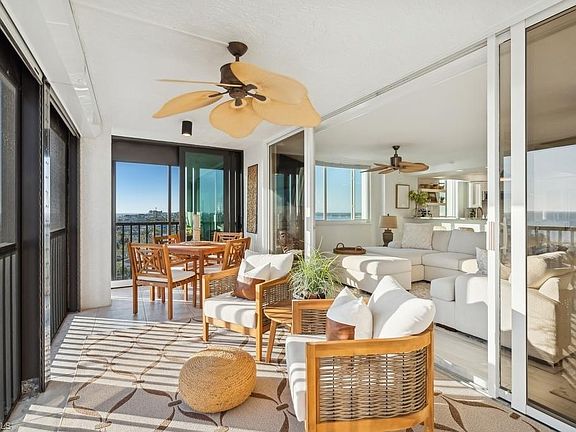Your front-row seat to year-round beach sunsets awaits at Ocean Harbor, a premier gated community located mid-Island on Fort Myers Beach offering sweeping Gulf and Bay views. This split-floorplan 2-bedroom, 2-bath condo is being sold turnkey, complete with everything from cookware to linens for an effortless move-in experience. The updated kitchen features custom cabinetry, granite countertops and matching KitchenAid appliances still under warranty, while porcelain tile flows through the main living areas. The open-concept great room includes a wet bar and sliding doors that lead to a private lanai overlooking the Gulf, the perfect setting to unwind and take in endless sunset views. The master suite offers direct Gulf views, a walk-in closet and a remodeled bath with dual vanities, granite countertops and a glass walk-in shower. The guest bedroom and second full bath are ideally positioned for comfort and privacy when hosting family or friends. Most updates were completed in 2021 or later. Additional features include hurricane-impact windows, crown molding, fresh interior paint and updated trim throughout. Ocean Harbor residents enjoy direct beach access, on-site boat docks with slips available for purchase and resort-style amenities including a newly renovated pool, clubhouse, fitness center, 6 pickleball courts, 2 tennis courts and lush tropical landscaping. A private entrance connects directly to Publix, Snook Bight Marina and two favorite island restaurants—Junkanoo Below Deck and Fresh Catch Bistro—with convenient access to the island trolley stop. All assessments have been paid. Schedule your private showing today.
