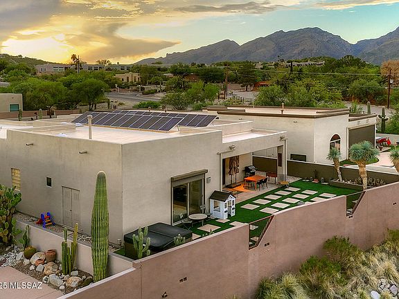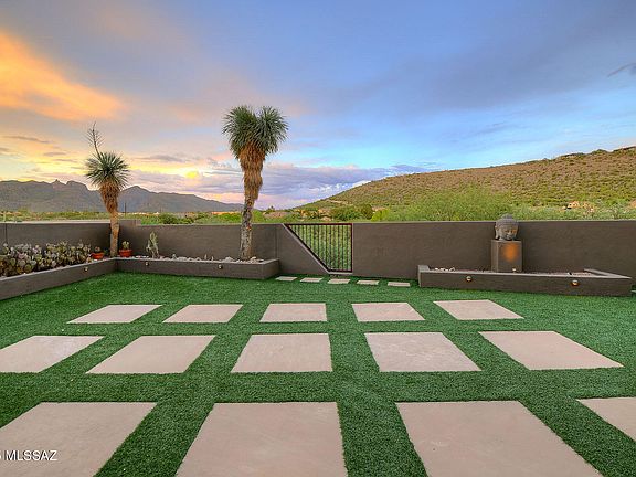 Enjoy beautiful Catalina Mountain views from this contemporary home in a small gated community near Sabino Canyon. The open floor plan features high ceilings, curved walls, travertine floors, and a stacked stone double-sided fireplace that anchors the living area. The kitchen offers maple cabinetry, granite countertops, stainless steel appliances, a walk-in pantry, and a large island. The remodeled primary suite provides mountain views, a spacious walk-in closet, and an updated bath with two separate vanities, walk-in shower, and modern finishes. Three additional bedrooms and two additional full baths provide space for guests or a home office. Step outside to a private backyard with a covered patio, turf area, above ground hot tub and an owned solar system.