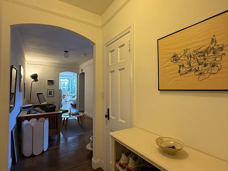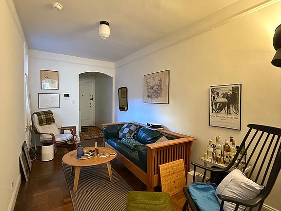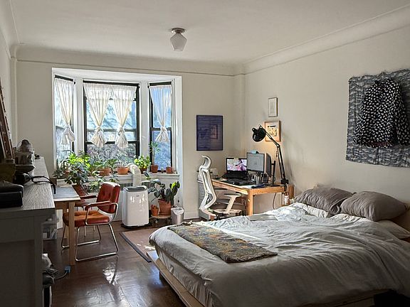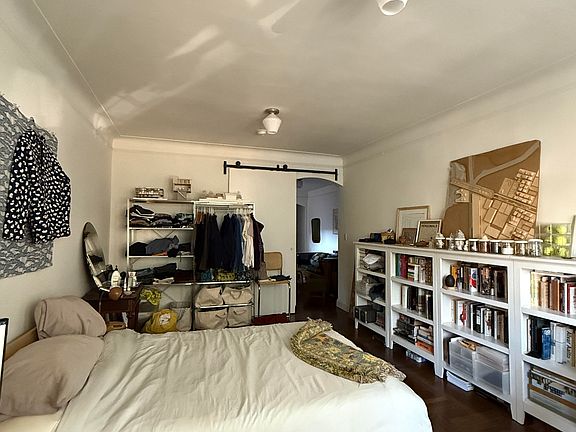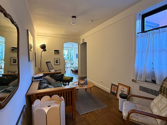 The apartment has beautiful original details and wood flooring as well as windows in every space. The space could work great as a two bedroom (as it is shown in the photos) or a large one bedroom. Each room has ample space for work from home setups and hosting guests. For reference, photos are showing queen size beds. The kitchen includes a dishwasher and microwave (in addition to gas stove/oven and fridge) and fits a small breakfast table for two. The building has radiator heating and no central AC. However, window air conditioning units for the main spaces can be kept in the apartment if desired. The apartment will be completely empty for the tenant - all furnishings shown in photos will be removed.