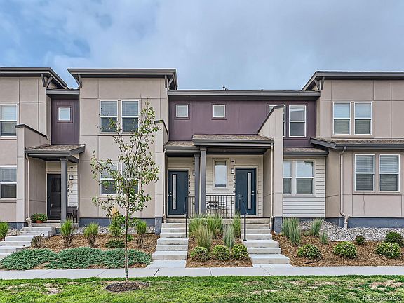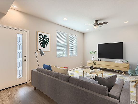 Are you tired of the uncertainty of interest rates? The seller is now offering concessions to help cover some of the costs associated with purchasing a home in this new market. Additionally, this move-in-ready townhouse may qualify for a $5,000.00 Homebuyer Grant. This home is conveniently located between DIA and Downtown Denver, and adjacent to a brand-new Costco. As you enter the great room you will notice the new LVP flooring throughout the main level. The kitchen has all stainless steel appliances, a pantry, and a breakfast bar for convenient dining options. There is also a powder room on the main level with an upgraded vanity to provide additional storage. The two bedrooms and laundry room are on the second level. The primary bedroom includes a walk-in closet with custom shelves and an en suite bathroom with a walk-in shower and double sink. The secondary bedroom and full bath are at the front of the home, also en suite, with the laundry room at the top of the steps. All appliances, including the stackable washer and dryer, are included. The garage has an interior hose bib and a 220v plug for your electric vehicle charger. The pool and rec center (The HUB) are maintained by the Metro District and paid for through property taxes.
