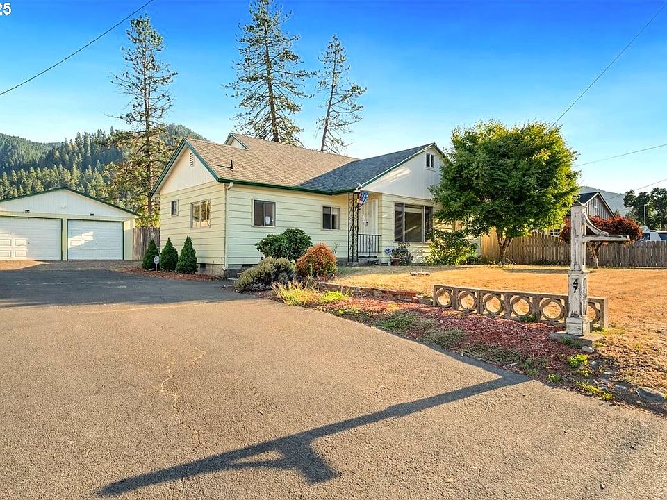 Looking for a great place to call home in Oakridge with views of the mountains, shopping right around the corner, and the river just down the street? Look no further! This 3 bedroom home has been updated over the years with newer roof, paint, and as of just recently a brand new roof on the garage. Primary bedroom has plenty of space and ensuite bathroom. Cozy living room with pellet stove and built in cabinets leads you to spacious kitchen and separate dining area. Back deck perfect for BBQ's and relaxing on the summer evenings, with covered back patio for the rainy months. Separate full bathroom with newer flooring. Detached large garage with washer/dryer hook ups. Fully fenced backyard on 1/3 acre lot leaves plenty of room for possible subdivide or ADU? Buyer to perform due diligence on options!