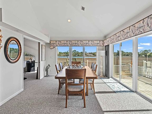 Welcome to this stunning custom-built waterfront home 3-bedroom, 2-bath estate features breathtaking panoramic water views, abundant wildlife, and a large lot that give privacy from neighbors. The living room has a vaulted ceiling with a stained glass dome that illuminates a beautiful pattern during the daylight and custom built-in shelving with storage and space for your television. The kitchen has a new stainless steel Frigidaire dishwasher, and a refrigerator along with a built-in microwave and breakfast bar. The primary suite is located on its own wing overlooking the Bayou. One of the additional bedrooms offers an en suite bathroom and the other bedroom has sliding doors which lead you onto a deck that wraps around the entire rear of the home. The deck also has a staircase which leads you downstairs to the spacious covered patio and two-car garage. There is a tool shed below the home as well to store all your outdoor gear! This location is prime with a short distance to restaurants, shopping centers, and a 35 minute drive to Pensacola Beach! Schedule your showing today!