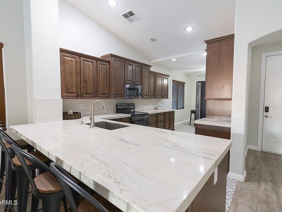 Step into sophistication with this beautifully updated 3-bedroom, 2-bath residence. Designed with open-concept living in mind, the home welcomes you with soaring vaulted ceilings, abundant natural light, and a seamless flow between the living, dining, and kitchen spaces. The gourmet-inspired kitchen features a generous breakfast bar, pantry, and ample cabinetry—ideal for both everyday living and entertaining.