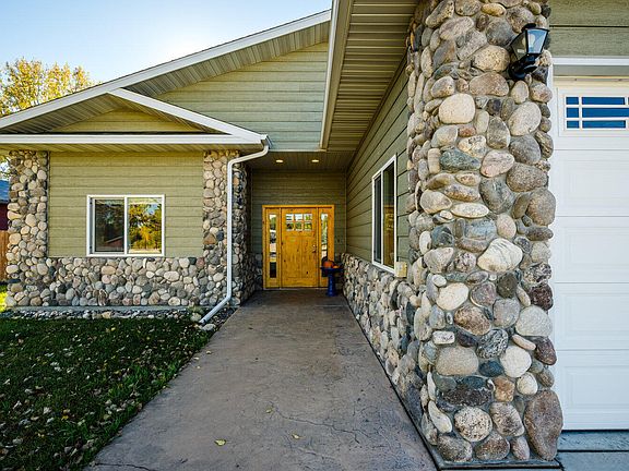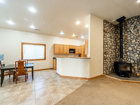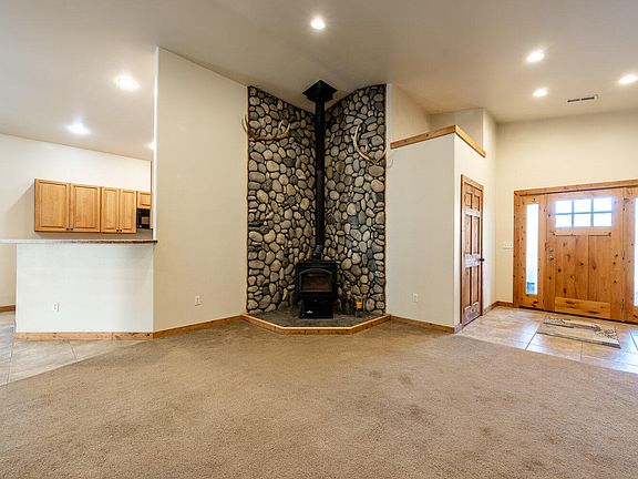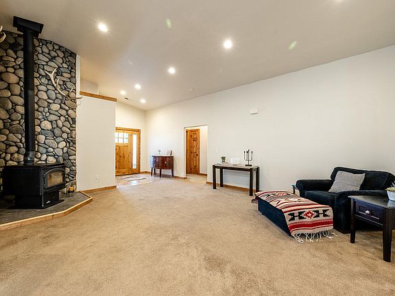 Welcome to this beautifully maintained one-level home nestled in the quaint town of Ranchester. Home is move-in ready with numerous upgrades (furnace & heat pump, north windows, roof, gutters, water heater, and most appliances. Natural gas conversion in 2021). Offering ADA accessibility, this home blends comfort, functionality, and rustic charm. Stamped concrete walkway leads to a custom front door framed with river rock wainscotting. More river rock inside the open concept living space with vaulted ceilings and knotty pine trim & doors. Wood-burning stove adds heat for cozy Wyoming winters. Kitchen features bar seating and Kraft-maid soft close cabinets. Inviting primary suite includes a walk-in closet and spacious four-fixture en-suite. Additional flex space offers versatility - family room, office, or even a fourth bedroom. Access the partially covered back patio through this space or the primary. Fully fenced back yard is ideal for children or pets, but can easily be accessed through the large gate for storing those ATV's. Custom-built storage shed adds convenience and utility. Located across from Rotary Park Pond with easy access to walking paths and TR Elementary, this home is perfectly positioned for both relaxation and community connection.
