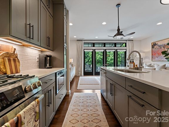 Urban Brownstone Living At It's Best! Tucked on a quiet cul-de-sac, this 3BR/3.5BA Saussy Burbank townhome offers rare luxury and walkability in Charlotte’s Arts District. Overlooking the green of the Johnston Y and the quaint coffee garden of Caffetto Specialty Coffee, this location in NoDa cannot be beat - the best of "all the action" while tucked within the trees an uber-private feel inside. Post construction, this homeowner put in an additional $60,000 worth of designer upgrades: custom floor-to-ceiling living room Cypress built-ins with high-end lighting, Stark stair runners, high-end ceiling fans, and a powder room with statement wallpaper. The open-concept main level features quartz countertops, Bosch appliances, full-height backsplash, and custom lighting. Primary suite boasts seasonal Uptown skyline views, freestanding tub, glass shower, and walk-in closet. Junior primary with Juliet balcony + ensuite bath, plus lower-level office/bedroom with full bath. Additional perks: epoxy garage w/ EV charger, laundry w/ upgraded cabinetry & W/D, and balcony with privacy screen for indoor/outdoor living. Two-car garage and energy-efficient systems. Walk to light rail, the new Sprouts grocery store, the new McHale's Irish Pub, and staples like Haberdish, Cabo, and Goodyear House.
