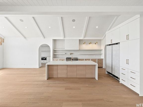 Complete within 30 days- A truly one of a kind custom BRAND new build in the heart of one of Alpine's finest communities. Step into this Modern Mediterranean inspired style home, designed to capture stunning panoramic view of all of Utah Valley & the Wasatch Mountains from every window. Boasting a spacious open floor plan including a Grand 2 story foyer, gourmet kitchen with quartz waterfall countertops, butlers pantry, dedicated dining area, and oversized great room ideal for effortless entertaining or gatherings. Additional features include: theater room, exercise room with floor to ceiling mirrors, bunk room with built ins, 880 sq ft 23 ft tall indoor sport court with separate entrance to exterior, dedicated study area with built in desks and a "escape" room for meditation, and a 4 bay garage with 1 heated bay 16x32 garage bay for all the toys. This home has been uniquely crafted with high quality finishes and features indicative of the modern Mediterranean vibe complete with a cooling white backdrop, relaxed neutrals, wood finishes, labor intensive Tadelakt plaster technique throughout showers, kitchen, and fireplaces, arched door ways, handmade concrete tile floor, iron railing, tongue and groove ceiling, and rattan modern lighting. These all create a bright, warm, inviting, and rustic yet elegant space.