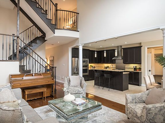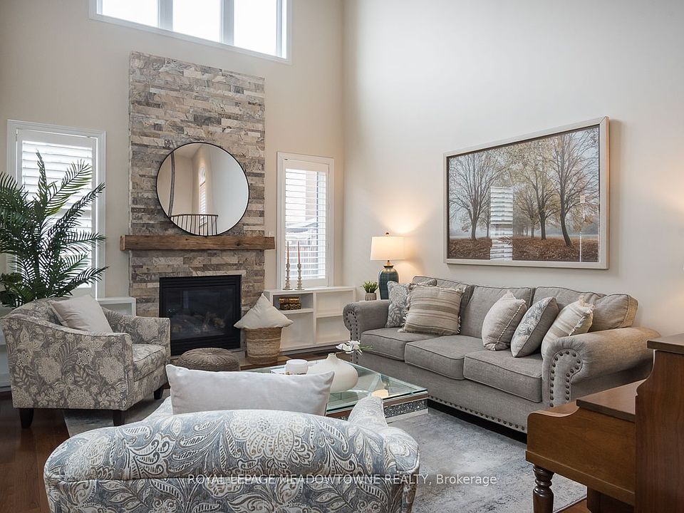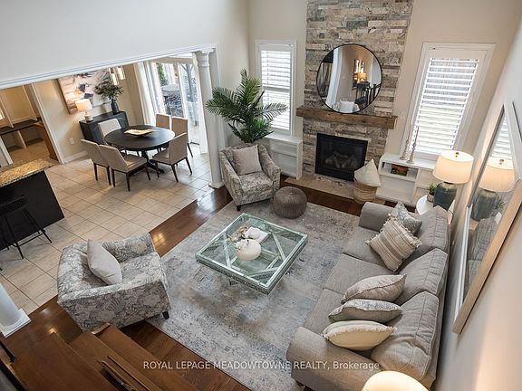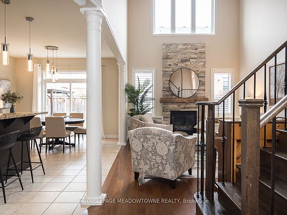 Welcome to this beautifully designed 4-bedroom home, featuring a versatile 3rd-floor loft that serves as a 5th bedroom, home office, or bonus space - boasting over 4,300 sq ft of living space. This home is perfect for growing families or guests. Nestled in a sought-after neighborhood steps to schools, parks, and community centre with no sidewalk, this home offers a double garage and total parking for 6 vehicles, providing ample convenience for homeowners and visitors alike.Step inside to a neutral color palette that enhances the abundance of natural light throughout. The main floor boasts gleaming hardwood flooring, a functional mudroom, and a breathtaking vaulted family room with soaring ceilings and a cozy gas fireplacea perfect space for relaxation. The spacious eat-in kitchen is a chefs dream, featuring stainless steel appliances, a large island, ample counter space, and room for the whole family to gather. The professionally finished basement includes egress windows, a large recreation room, an oversized bedroom with a walk-in closet, generous storage space and a rough-in for an additional bathroom. This home offers the perfect blend of comfort, style, and convenience, located close to the conservation parks, downtown Milton, and the Tremaine overpass. Dont miss out on this incredible opportunity!