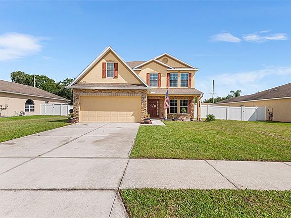 This updated 3 bedroom, 2 and a half bath home with a loft is packed with charm, updates, and space for everyone. Inside, you’ll find new flooring, a refreshed kitchen, fresh paint, and an updated primary bath that feels like a retreat. The family room’s custom fireplace adds warmth and character, creating the perfect spot to gather. The thoughtful design includes tons of storage throughout, plus a new AC for peace of mind. Step outside to enjoy the huge yard and vinyl privacy-fenced backyard, ideal for pets, play, or entertaining. All this comes with an unbeatable location with an easy commute to Tampa or Orlando while still enjoying the space and comfort of a true home setting. Move-in ready with modern updates and timeless appeal, this home is one you don’t want to miss.