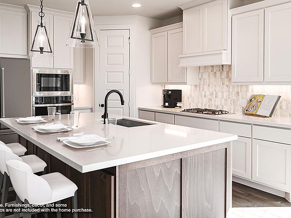 Home office with French doors set at two-story entry. Two-story family room with a wood mantel fireplace and sliding glass door opens to kitchen and dining area. Kitchen hosts inviting island with built-in seating space. First-floor primary suite includes dual vanities, garden tub, separate glass-enclosed shower and large walk-in closet in primary bath. A second bedroom is downstairs. Two secondary bedrooms and a game room are upstairs. Extended covered backyard patio. Two-car garage. Representative Images. Features and specifications may vary by community.