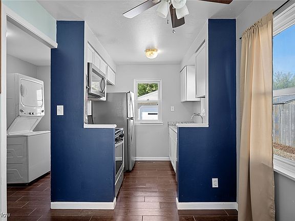 Modern fixtureSpacious exterior patioLarge windowsFirst-floor laundryStackable washer and dryerWood-fenced backyardUpdated cabinets