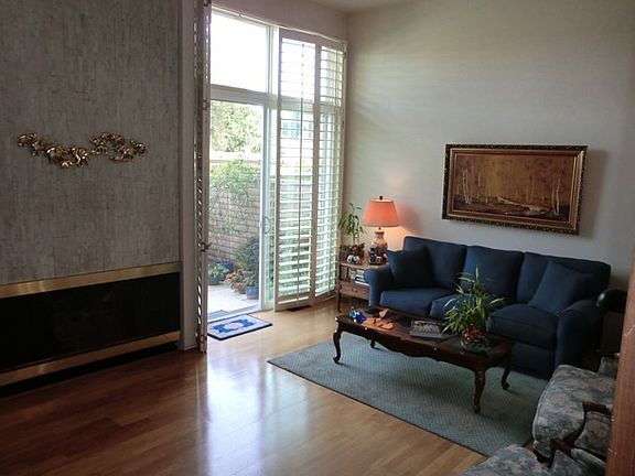 Beautiful bright unit with plantation shutters throughout. Hardwood floors in living area, soaring ceiling and fireplace. Kitchen has breakfast area and breakfast bar with separate laundry room off the kitchen. The living room has access to private enclosed brick patio. 2 bedroom plus office/den/3rd bedroom space on 3rd level. Master suite has high dome ceilings with skylights. Master bath has vanity area. 2 car entry garage with storage space. Walk out the front door to pool and courtyard area. Walk to chic shops, trendy restaurants, dine in theater and concerts in the park in the summertime.