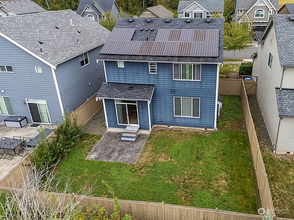 Loaded Deluxe Home includes solar panels, forced air w/ heat pump & AC, plus instant hot water for more savings. Low to zero electric bills. Unique open space behind the home, a nice fenced yard, west views of the beautiful PNW sunsets. Main floor has a half bath, deluxe kitchen- marble counter tops, loaded w/ nice cabinets, and a big bar for entertaining & daily living. Tall ceilings, ample dining room, glass slider to the patio and a nice fenced yard. Livingroom w/ gas fireplace makes this home cozy. Open stairwell to the top floor- primary bed/bath w/ glass shower, double sinks & a walk-in closet. 2 more bedrooms, w/ a nice main bath. Super capacity washer & dryer too. Double car garage on main floor with room for storage and hobbies.