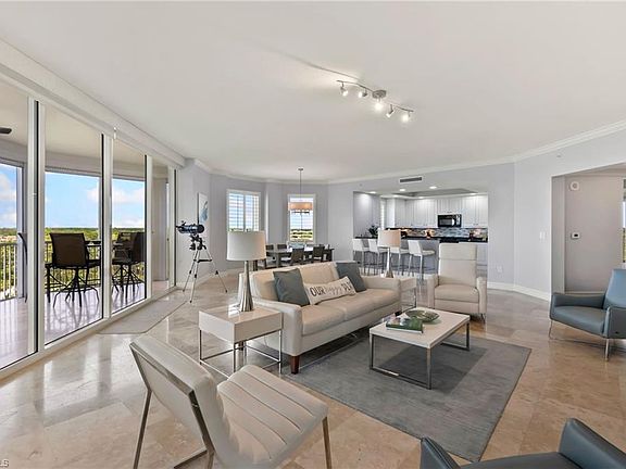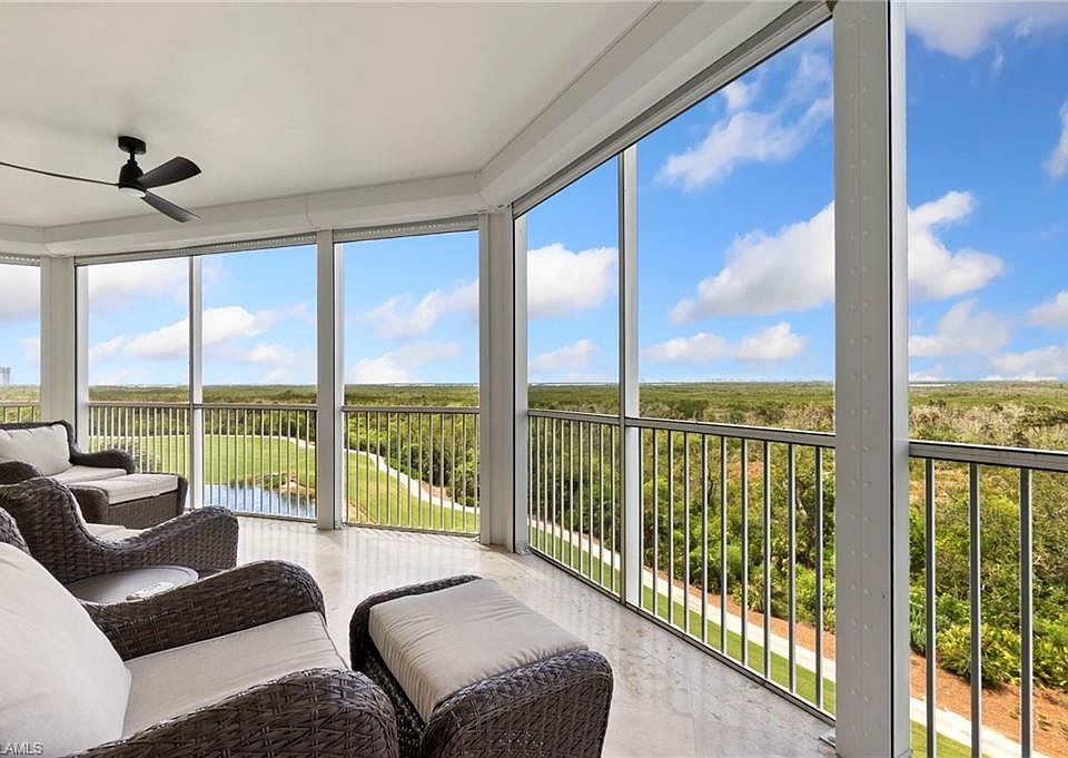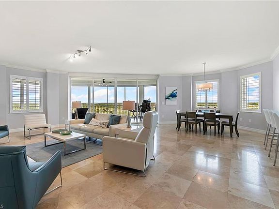 This beautifully appointed 5th floor condo offers the highly sought-after location – private end of the North Tower in Jasmine Bay with unobstructed western sunset views over the lake, golf course, preserve, and Estero Bay right to the Gulf. With 2342 sq. ft. under air, 3 bedrooms and 3.5 bathrooms, the floorplan is open and airy with light neutral tones and Travertine marble flooring in all main living areas and on the spacious wraparound balcony. From the private elevator foyer, the condo opens to the generous great room and dining area showcasing panoramic views. The master suite includes a huge bathroom, his-her fitted closets, and access to the balcony. A separate hallway leads to two guest suites with private bathrooms and second balcony. The gourmet kitchen features granite counters and newer refrigerator. Other features include tall pocketing sliders to the balcony, coffered ceilings, crown molding, plantation shutters and hurricane shutters on the lanai. New AC. Jasmine Bay offers an array of resort-style amenities, including a fully equipped private gym, club room, card room, movie theater, and a stunning infinity-edge pool with hot tub. Enjoy outdoor relaxation in private poolside cabanas or take advantage of the gas grills located on the pool deck. The towers also offer four spacious guest suites perfect for overflow guests. West Bay Club amenities include a new private Beach Club on the Gulf of Mexico with a restaurant/bar, plus chair and towel service. The newly renovated Bay House offers a resort-style pool, yoga studio, Pilates, stretching, spinning room, sauna, Aqua Cafe poolside restaurant for indoor or poolside dining, 8 clay tennis courts, and a Technogym state-of-the-art fitness center. West Bay’s River Park is on the Estero River and features a fishing pier, boat launch w/Gulf access, boat storage, kayaks/canoes, playground, basketball court, picnic areas, and a 1.5-mile walking trail. The Sports Park offers residents 6 pickleball courts, a fitness lawn, bocce courts, and 2 separate dog parks. Memberships are also available to the private 18-hole Pete and PB Dye golf course and clubhouse.
