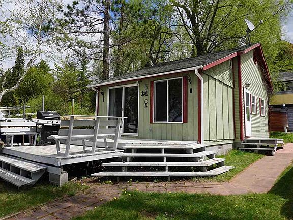 INCREDIBLY-AFFORDABLE LAKE CABIN! Sunset lake views can be yours in this close-country, seasonal and cozy 1+BR cabin on Amnicon Lake! Tucked between many little cabins, this is a little slice of Heaven! Living room with dining area and patio door to deck, both with lake views! Kitchen with serving window to dining area allows for views of lake! Loft bedroom accessed by steep but solid wood stairs and main-floor bedroom! Private shower room with sink! Outside is storage shed, porta-potty that seller owns and a porch! Off-street parking for 1 & street parking. Close to dining, conveniences, boat ramp, more lakes, golf course & Pattison State Park! Access to snowmobile & 4-wheeler trails from cabin for recreational & hunting use! Swim, fish or just dangle your feet in the water while watching the sunset-37.5" of waterfront with gradual-sloping sandy beach! Includes: Rf, st, microwave, portable john aka porta potty, lp tank, dock, picnic table, gas grill, all furnishings & decorations currently on property.
