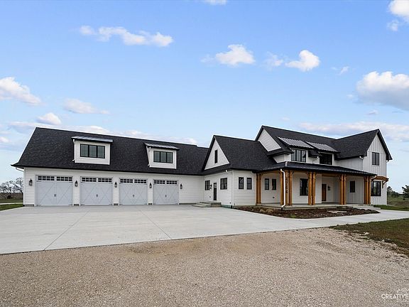 Indulge in the ultimate country living experience with this NEW exquisite custom farmhouse set on an expansive 26.42 acre lot. Boasting 5 bedrooms, 4.1 bathrooms, and 5 car garage, this home offers an unparalleled blend of sophistication and comfort. Step through the custom craftsman style front door and into a world of timeless elegance. The inviting front porch sets the stage for warm welcomes and relaxed evenings. The heart of the home is the gourmet chef's kitchen, where Knotty Alder soft-close cabinetry, quartz countertops, and stainless-steel appliances await. The center island, bathed in elegant pendant lighting, beckons culinary adventures, while a custom walk-in pantry keeps everything organized. Retreat to the main level master bedroom, featuring stunning hardwood flooring, a striking board and batten wall feature, and access to an extended deck overlooking the picturesque landscape. Two walk-in closets ensure ample storage, while the master bathroom stuns with penny round tile flooring, a luxurious soaking tub, dual vanity, and a spacious walk-in shower. Entertain with ease in the recreation room above the garages, offering endless possibilities for leisure and fun. The walk-out basement, equipped with radiant heat and rough-in plumbing, is primed for your personalized touch. Ascend to the second level, where a spacious loft area provides a bird's-eye view of the two-story family room below. Four bedrooms await, including one with its own private suite, two sharing a convenient jack and jill bathroom, and the last just steps from its own hallway bath. Embrace the great outdoors on the expansive lot, where endless adventures await. Whether you're relaxing on the front porch or exploring the vast grounds, this property offers unparalleled luxury with privacy.