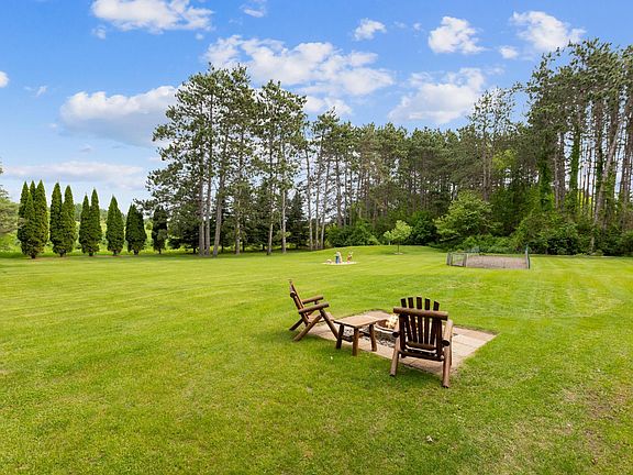 The exterior is designed for outdoor living, featuring a sprawling deck that overlooks a perfectly manicured lawn. There is a fenced garden, a firepit area for evening gatherings, and a separate driveway accessing a heated 20x32 pole building equipped with electricity. The pole building, additional utility shed, and rear of home tuck under storage space provide tons of room for all of your tools, 4 wheelers, motorbikes, snowmobiles and more. Convenient location to BCMX Adventure Park.