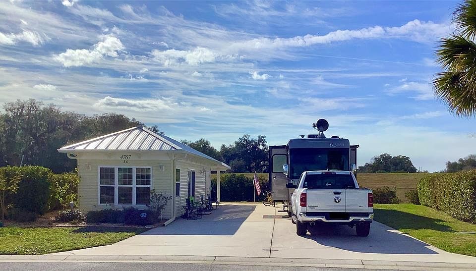 If you’re searching for a home base for yourself and your motorhome, this one needs to be seen! This back-in property has no neighbors directly in front, and the pie-shape of the property gives extra space out back. The 12’x32’ Grande Suite comes furnished, and has ceramic tile floor, wide baseboards, and crown molding. The Grande Suite also comes with a full bathroom with step-in shower, and storage area with washer/driver hookups and a water softener that also runs to the coach. A solid surface pergola out back gives shade while being able to enjoy beautiful Florida sunsets. Florida Grande is a gated Class A and Super C community in central Florida just an hour away from both Tampa and Orlando. It is both family-friendly and pet-friendly (up to 2 pets per property). POA dues are $724/quarter, and include water, sewer, trash pickup at dumpster, dog park, pickleball, pool, spa, and 20,000 sq ft clubhouse. Many activities and events take place in the resort’s Grande Room such as line dancing, yoga, community dinners, bingo, trivia, and happy hours. Card games are played in the game room many times a week. Appointments are required to visit the resort for safety and security of our owners and guests. Please call or text for your appointment. Priced to sell! This one won’t last long!