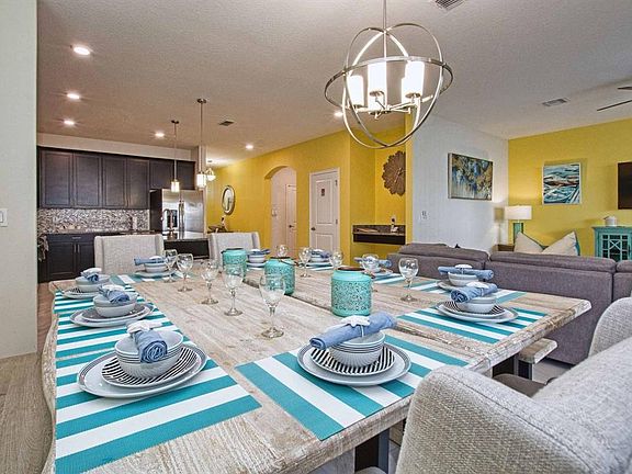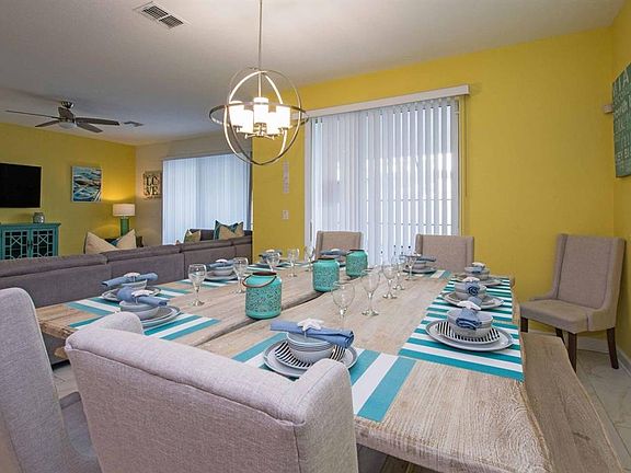 FULLY FURNISHED! This stunning 6-bedroom, 5-bathroom home is perfect for short-term rental investment or as a resort-style residence. The open floor plan is bathed in natural light, creating a welcoming atmosphere. Enjoy a private screened pool and outdoor space for relaxation. The kitchen boasts stainless steel appliances and granite countertops, which are also featured in all bathrooms. The master suite on the second floor offers a resort-style luxury bathroom. Prime Location: Situated just 5 miles from Disney, this property is ideal for short-term rentals. Residents and guests can access resort-style amenities, including nearby shopping, dining, and entertainment options. The community features a Tiki Bar/Grille, canoe/kayak rentals, a lazy river, a fitness center, miniature golf, a quiet pool, a splash pad, a double slide, a volleyball court, and a sports court. Experience endless fun and relaxation! Don't Miss Out! Schedule your private tour today to see this exceptional property firsthand.