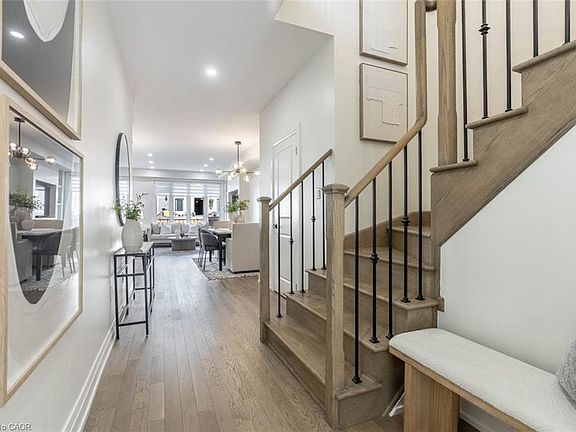 Immaculately maintained and beautifully upgraded, this 4-bedroom, 4.5-bath Great Gulf townhome offers over 2,000 sq. ft. plus a finished basement in Milton’s popular Ford neighbourhood. The main floor showcases oak hardwood, pot lights, and a modern electric fireplace, with an open-concept layout that connects seamlessly to a quartz kitchen featuring a 7-ft island, quartz slab backsplash, stainless steel appliances, and a fabulous walk-in pantry. Upstairs is designed for family comfort with three full bathrooms, including two private ensuites—a rare feature that adds unmatched flexibility. The primary retreat includes a walk-in closet and a spa-inspired 5-pc ensuite with double vanity, glass shower, and soaker tub. A finished basement extends your options with a den behind sliding barn doors, pot lights, and a stylish 3-pc bath. Smart upgrades, fresh paint (2025), and pride of ownership throughout make this a true turn-key home, steps to parks, schools, shopping, and transit. This luxurious home features all the upgrades you're looking for, along with a premium location suitable for the entire family. Don't miss this one - it's a must-see.