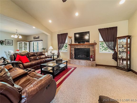Custom-built with a thoughtful floorplan on a 3/4-acre lot in a secluded, well-kept Camdenton neighborhood within walking distance of the library and schools. The main level features vaulted ceilings, a gas fireplace, and a spacious kitchen with loads of cabinet space and all new appliances installed in 2021. Outside, a new composite deck—added last year—an ideal spot for BBQs on a fall evening. A stamped concrete entryway sets a welcoming tone at the front of the home. The roof and gutters were replaced just two years ago with warrantied leaf guard, and the property is on community water and sewer. The yard is large enough to enjoy yet still easy to maintain. The oversized primary suite gives you plenty of room to spread out, and all bedrooms are carpeted for comfort. The lower level adds even more living space with a second family room, integrated speakers, custom bar, 1-bedroom, walk-out patio, and generous storage. Oversized two-car garage includes plenty of cabinet space for tools or hobbies, while the level concrete drive provides practical parking and easy access. Owned by the same family since 2008, this home has been well cared for and is ready for its next chapter.