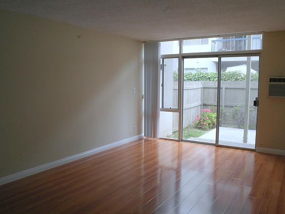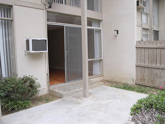 Freshly painted 1st floor apartment with private patio! Beautiful wood flooring throughout unit. Large floor to ceiling windows in living room and bedroom. Kitchen has cool tiles, a new stove (to be installed), a refrigerator, and plenty of cabinet space. Wall A/C in living room and wall heater in living room and bedroom. Private patio is perfect for relaxing. Includes 1 covered parking space and shared laundry room on site. Water heater was updated recently providing hot water for the whole complex. Landlord pays for water and trash. Tenant pays for electric and gas. No smoking. No Pets. 1 reserved parking space. Shared Laundry Room.