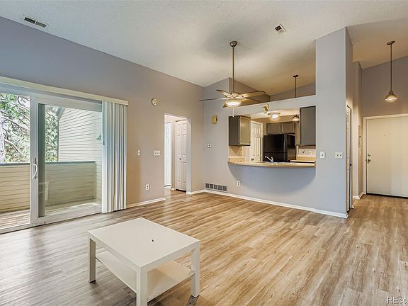 Delightful light & bright open concept condo. Newer hot water heater & furnace & new windows & sliding glass door installed in 2020!! Lot's of privacy as being on the top floor precludes having anyone living above you & also allows for vaulted ceiling in the main living area. Ergonomic kitchen with a good sized pantry close by. The "expanded" breakfast bar is perfect for accommodating bar chairs. The living room has a fireplace with windows on either side, still allowing for a T.V to be hung on the perpendicular wall if you'd like. Good sized bedroom & closet. In unit washer & dryer across from the full bath. The ample sized covered balcony is surrounded by trees, adding to a sense of privacy. There are 2 stand alone A/C units which are included. The owner used one in the living room & one in the bedroom. Great location near the Town Center of Aurora, Aurora Library & Buckley Air Force Base.