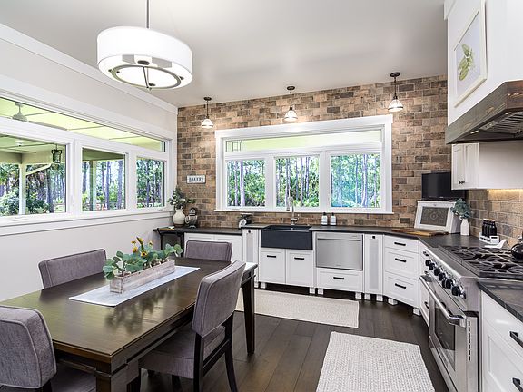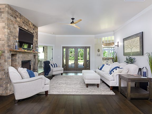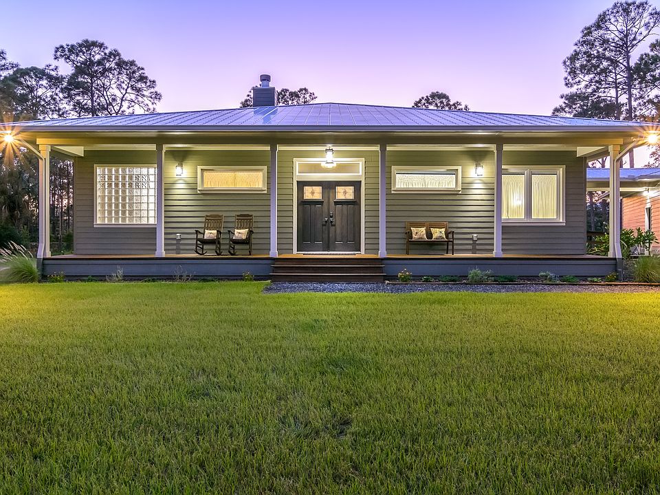 Modern design & cozy farmhouse feel create an impressive country estate! A metal roof & hurricane-impact windows envelope custom features, 2 bdrms. + an office/den. Charcoal-stained white oak hardwood floors punctuate a Chicago Brick tiled great rm. fireplace. The family style eat-in kitchen showcases soapstone counters, tailored baking station, farm sink, gas range & soft-close cabinetry w/specialized drawers. The master has its own Chicago Brick fireplace, exterior access & huge walk-in closet. Barn doors open to an en suite w/super-sized tiled shower, double soapstone vanities & self-close toilet. An elegant clawfoot tub hallmarks the 2nd bath. Off the great rm., French doors lead to a spacious back porch overlooking a big yard & woodsy view. Across the breezeway, the oversized 2-car...