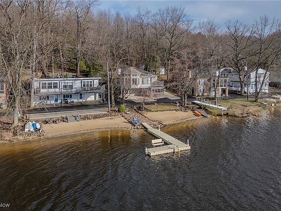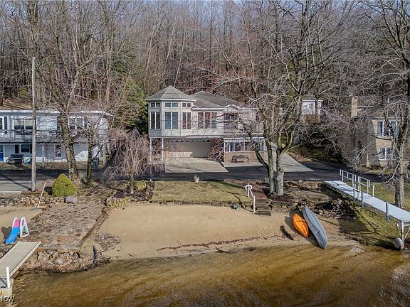 Lake front home nestled in a private community located in Rootstown. Included is a private beach and walk out dock. This lake is stocked with fish, and boats are allowed. (No gas). There are walking trails and fun summer events for all to enjoy. This well-kept secret is located off Sandy Lake Rd. From the minute you enter the private road you know your destination is going to lead you to somewhere special. The open floor plan has 4 bedrooms and 3 full bathrooms 2,690 sq ft on main level and an additional 1,000 sq ft on the lower level. The sunroom, living room, dining room, and kitchen offer panoramic views of the lake. There are 3 Beds and 2 Full baths on the main level. The all-weather deck off of the sunroom-dining room area offers relaxation above the hustle and bustle where blue skies and natures abounds and hosts a retractable Sunbrella awning. There is also a private back deck. The lower level offers a screened porch, 2 car garage that opens to a huge utility room that has plenty of room for storing canoes, bikes and a wonderful workshop area. There is a family room, full bath and bedroom on this level as well. A lift is attached to the stairs making it easy to get to the main level. This is truly a special home and property and a blessing to unwind from a busy lifestyle. The views are breathtaking. It can be a year-round home or a special summer getaway. There is a generator and all appliances stay. The additional 5 to 6 car parking beside the house is unique to this home. (The lower level could be transformed into an additional suite very easily). Updates include a roof in 2018 and AC/furnace and hot water tank in 2023. There is a reverse osmosis system and a air purification system. The land is leased by Sandy Lake Inc, a corporation made up of residents. The annual association dues pay for upkeep of roads and insurance. You maintain your own home. The views of the sunset are special This home is a gem.