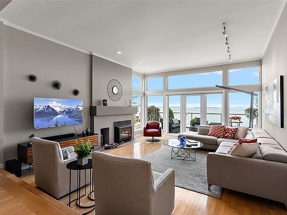 STUNNING, extremely private and super bright 3-bedroom (or 2-bedroom plus den) two-level townhome in the exclusive Seascape oceanfront community offering georgeous 180-degree views of Haro Strait, islands, and Mount Baker from almost every window, featuring gleaming maple floors, three brand new luxuriously finished bathrooms, fresh paint throughout, new carpeting in bedrooms, several skylights, and an elegantly refinished fireplace in the livingroom. 9-foot ceilings downstairs and dramatic ceiling vaults upstairs for an airy elegant feel. Everything is excelptionally clean and extremely well maintain with updated appliances and tasteful light fixtures adding contemporary charm. Enjoy two spacious decks and the private common area stairway to miles of beach at low tide. 20 minutes from the airport, 15 to downtown, and 10 to top-tier shopping, cycling, and golf, this meticulously maintained home with an attached double garage offers timeless luxury in a breathtaking waterfront setting.