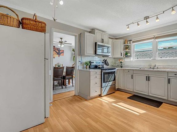 Detached oversized garageSouth backyardLarge yardBright kitchenAbundant white cabinetryWindow above the sinkBackyard views