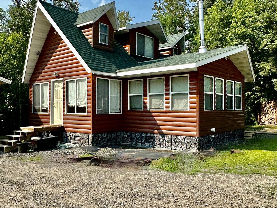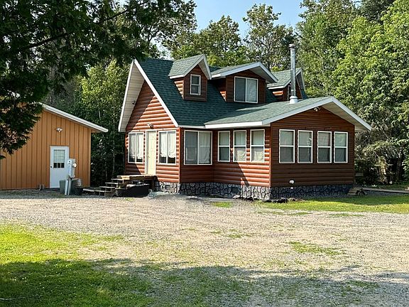 A gem of a home in the woods with bonus Littlefork River frontage! Truly a North Woods cabin feel to the home that boasts tongue and groove ceilings, half log interior and exterior, and a custom kitchen! Most of the 22 windows in the home are adorned with designer coverings to add to the charming warm feeling of the home’s interior. The home has an open concept to it, and you are able to view the LL and see the kitchen island area, breakfast nook, dining area, and LR with wood burning free standing stove. The UL is the main bedroom with open closet area. The 16X22 guest cabin houses additional accommodations along with a bath and laundry area. Add to all of this storage galore! 32X40 and 22X24 heated garages. Additional unheated 24X36 garage with 14X16 lean to. Trails on the 5 acres and a path to the river. This home and property has been well loved and will be yours to enjoy for years to come!