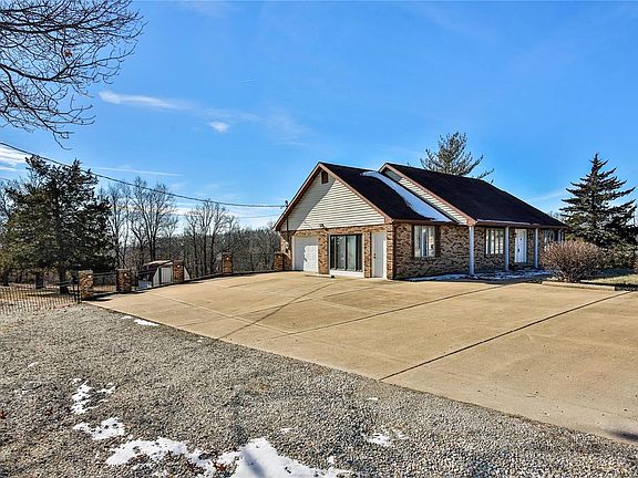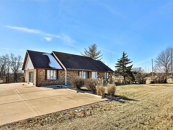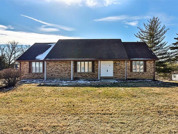Private lake and 12+ acres are just a couple amazing things to mention about this property. Updated ranch style brick home located right by Hwy 21 access. Home features 5 bedrooms, 3 full baths, 3 garages one on main level and two at walk out. Living room opens up to kitchen & dining area. The kitchen has beautiful custom cabinets, a center island with breakfast bar and large pantry. Off the dining area doors lead to the large deck that steps down to a gazebo with extra area perfect for entertaining guests or relaxing on a nice day. The main floor master has an updated master bath with shower. Also on the main level are two other spacious bedrooms with large closets and an additional full bath. Basement is nicely finished with gas fireplace, large area that can be used as a family or recreational room, 2 bedrooms and a full bath. Basement walks out to a large patio and access to the gazebo/deck. Additional storage shed, plenty of parking & beautiful open property make this a must see!
