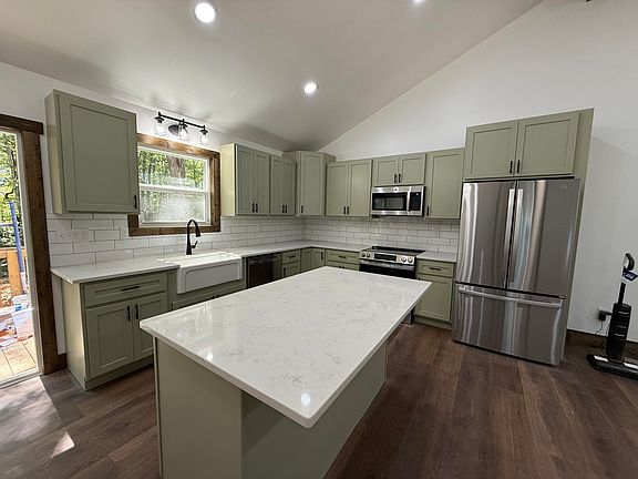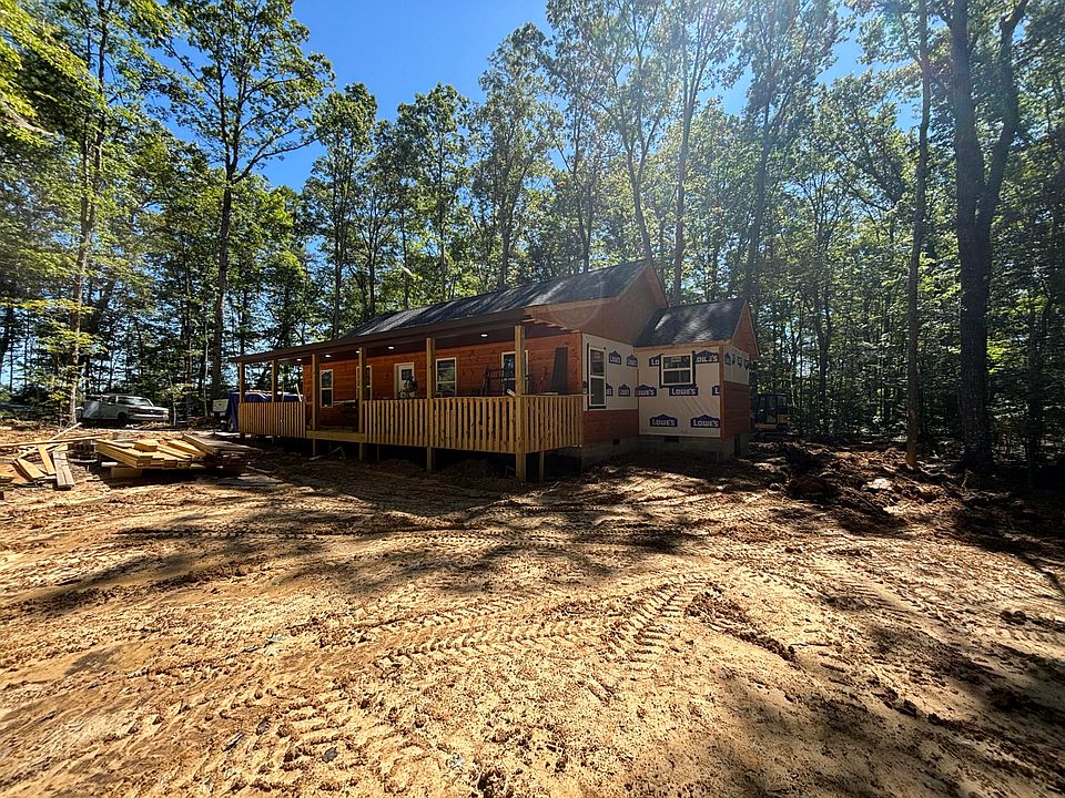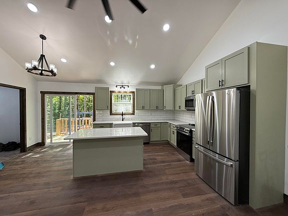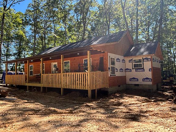 Welcome to your dream home—a stunning 2-bedroom, 2 bath sanctuary nestled approximately 400 feet off the road, offering unmatched privacy and tranquility. From the moment you arrive, the Dutch lap log siding and expansive front porch set the tone for rustic elegance and warm hospitality. Step inside to discover a show-stopping custom kitchen featuring rich green cabinetry, a farmhouse-style sink, and a layout designed for both beauty and function. A striking wooden beam runs seamlessly from the living room into the master suite, adding architectural character and cozy continuity. The master bath is a true retreat, boasting a luxurious soaker tub, double vanity, and a fully tiled shower with dual shower heads. The walk-in closet is oversized and thoughtfully designed with a built-in vanity table—perfect for your morning routine. Throughout the home, you'll find wood doors and handcrafted barn-style sliders that elevate the aesthetic. The living room features an extra-large ceiling fan for comfort and style, while a chandelier over the dining area adds a touch of elegance to every meal. This home is more than just beautiful—it's built for living well. Whether you're entertaining guests or enjoying a quiet evening on the porch, you'll appreciate the peace, privacy, and personality this property offers.