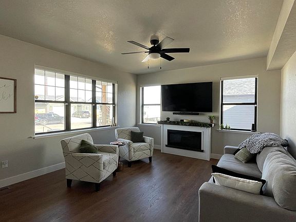 This home is better than new. Yard, fence and the drapes are up. Many rooms have been enlarged since this home was expanded from the original floor plan. A chef's kitchen with an eat in kitchen and formal dining. The private bath suite has a 5 piece bath and walk in closet. There is a large bedroom up stairs that could be an upstairs rec room or many other option. The lot has over 10,000 sq ft and a great view of the mountains. Many of the drapes are automatic. Security system and electric fireplace is included. Washer and dryer are also included. The garage is Longer than most to accommodate a full size 4 door truck.. Basement is set up for another bedroom, bath, and rec room. Water softener is leased. Call Kevin Bromley at 307-259-8087.