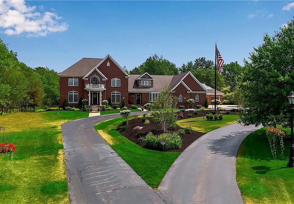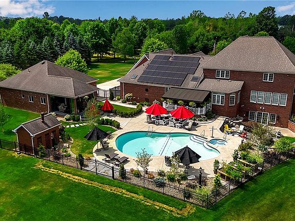 Welcome to this magnificent all-brick estate offering 8,263 sq. ft. of luxurious living (including the walk-out basement) on 4.63 beautifully landscaped acres in the prestigious Spaulding Estates. A fully remodeled first-floor master suite anchors the home, featuring a new brick fireplace and carpet, a brand-new spa-inspired bathroom with Kohler body sprays, new cabinetry, fixtures, lighting, and custom closets. Five additional bedrooms plus a bonus upstairs storage area, along with a total of 4.5 baths, provide abundant space for family and guests. The dream kitchen showcases custom cabinetry, granite counters, and updated appliances, flowing into a family room with coffered ceilings, a full-view Mendota fireplace with stone façade, and a Samsung “The Frame” TV—one of four included with the home. Sophisticated finishes and thoughtful updates are found throughout, including judges paneling, new carpets, porcelain tile, Cork Gold and grasscloth wallcoverings, custom window shades, interior shutters, and added crown molding. The dining room gleams with new hardwood floors, while a Marvin sliding patio door extends the living space to the outdoors and the motorized screened patio area. The finished walk-out lower level provides even more versatility. Outdoors, enjoy a sparkling saltwater gunite pool, fenced play area, and a pool house with sliding glass-paneled sitting area, indoor and outdoor kitchens, changing room, and half bath—perfect for entertaining. The grounds are sprinkled by well water, highlighted by new landscaping, xeriscape design, a new awning, and elegant lamp posts with self-watering planters equipped with electricity for seasonal lighting and holiday decorating. Energy efficiency meets modern convenience with solar panels averaging just $25 per month, in-floor radiant heat in the detached garage, and three Tesla charging stations. The attached garage offers heat and AC. With 6.5 garage spaces for the car enthusiast, freshly painted interiors, and countless custom upgrades, this property combines timeless elegance with modern comfort. Truly, a rare opportunity to own one of the area’s most remarkable estates.
