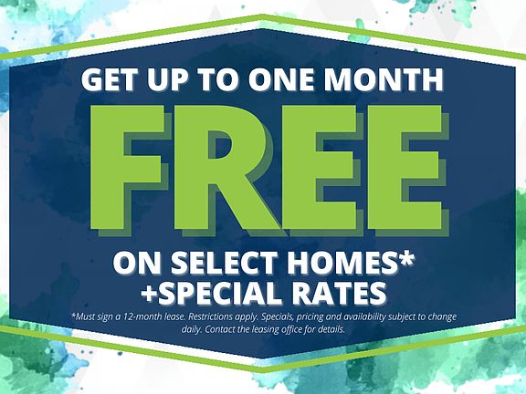 - Special offer! Get up to One Month Free on select homes! + Special Rates! *Must sign a 12-month lease. Restrictions apply. Specials, pricing and availability subject to change daily. Contact the leasing office for details.