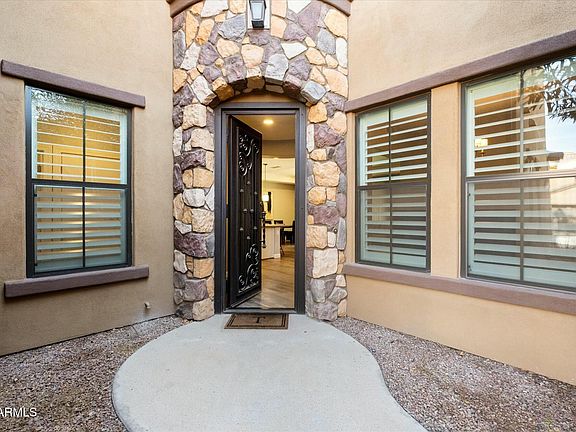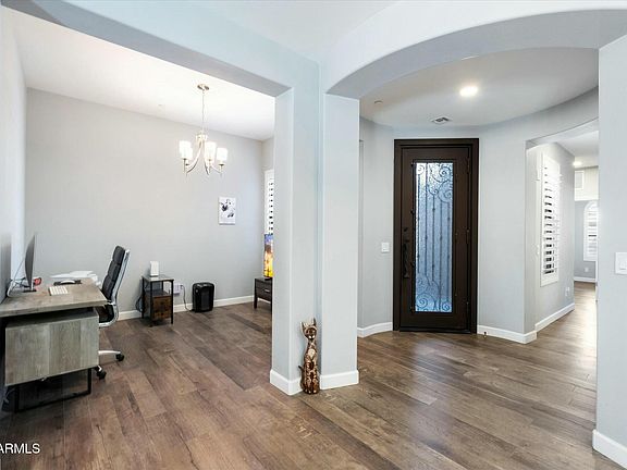 Rare GROUND FLOOR, Single-Level w/ GARAGE in privately gated Serenity Shores! This spacious and modern 3bed/2bath home offers an open-concept design with wood-like flooring, soaring 10ft ceilings, and elegant shutters throughout. The luxurious master suite boasts a spa-like bathroom, while the gourmet kitchen is perfect for entertaining! A separate office/den adds versatility, and a full laundry room enhances convenience. Direct entry from garage and backed by a lush greenbelt, this home offers privacy and tranquility. The resort-style community clubhouse features a heated pool/spa, fitness center and covered ramada with BBQ—all designed for a lifestyle of comfort and relaxation...(continued) ...Close proximity to High Tech Employment Corridor, fabulous dining & shopping, championship golf, Arts & Entertainment. Convenient access to Phoenix Sky Harbor International Airport from nearby I-10 & 202 Freeways. Don't miss this rare opportunity to own one of the most desirable homes in Serenity Shores at Fulton Ranch!