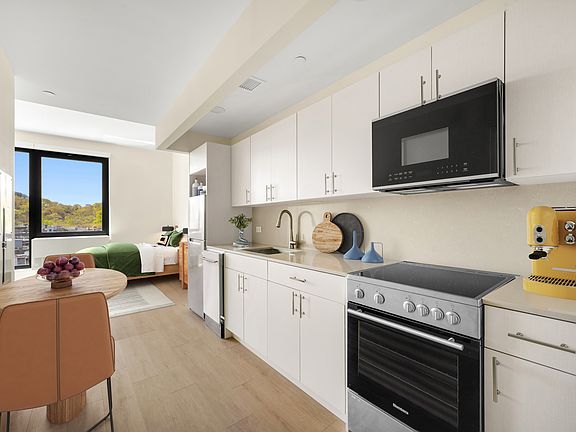 Tryon North features a mix of graciously appointed studio, 1br, and 2br layouts, with select units featuring private outdoor space. A blend of modern naturalism, each unit features wide-plank flooring in natural blonde and tall ceilings that enhance the sense of spaciousness and light. Modern kitchens boast silver sand Caesarstone counters, abundant cabinetry, and a stainless steel appliance package that elevates both style and functionality. Retractable kitchen faucets, integrated microwaves, and high-end Blomberg dishwashers streamline meal prep and ensure effortless cleanup in this contemporary culinary sanctuary.