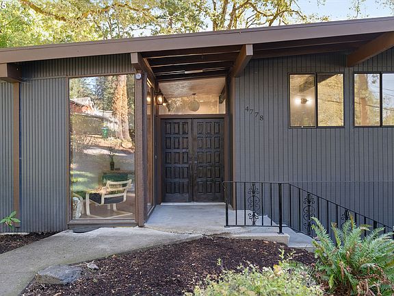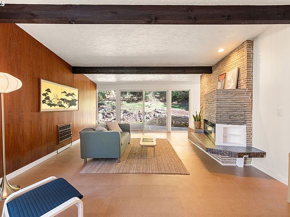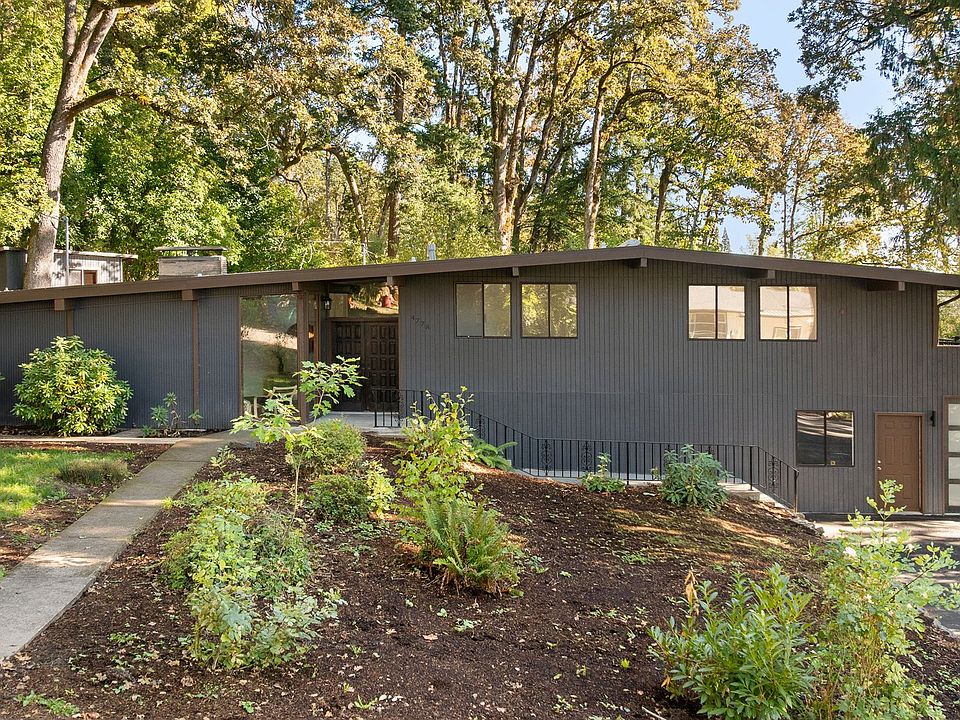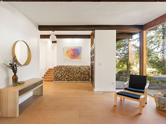 Custom mid-century modern atomic ranch, this groovy architectural gem was designed for a modernist lifestyle and perfect for entertaining. Step inside and be greeted by the warmth of the new cork flooring that extends throughout, complemented by high vaulted ceilings that enhance the sense of space and light. The double door entry greets you with vintage tile built-ins and the living room features floor to ceiling windows, a beautiful wood paneled feature wall and a cozy vintage brick fireplace with well preserved tile. The dining room is open to the updated kitchen with slate tile flooring, modern fixtures and quartz counters. The attached solarium is a natural light filled oasis brightening the interior spaces and is perfect for creating your own plant filled atrium or art space. This three-level home offers incredible versatility featuring a private primary suite on the upper level with an outdoor lounge space plus 2 additional bedrooms and a full bathroom all with updates, fresh paint and cork flooring. A large lower daylight level with separate living unit potential, featuring a spacious open living room, a separate entrance, and a full bathroom. The attached oversized garage has room for storage and a dedicated laundry room on the main level with built in linen and pantry storage. This one of a kind home was designed to contour the generously sized .32 acre lot that has mature oak trees and plenty of yard space. Sliding glass doors connect the indoors with the surrounding nature. Updates include new: interior/exterior paint, flooring, bathroom fixtures & cabinets,updated appliances, furnace, water heater. Located at the end of a low traffic road and just minutes to historic downtown Milwaukie with local shops, restaurants and the farmers market.