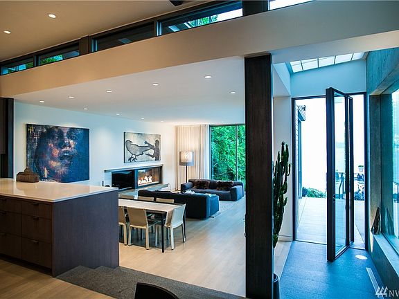 Stuart Silk designed modern residence on the shores of Lake Washington in Washington Park. Sublime, meaningful design exudes serenity & sophistication. 60 ft architectural concrete wall and floating steel & oak staircase provide the central design points, while the lake & Mount Rainier views beckon from nearly every room of this open concept home. White Oak Cabinetry, granite steps, slab quartz & glass panels are among the rich surfaces. Custom, rare furnishings included. Incredible opportunity