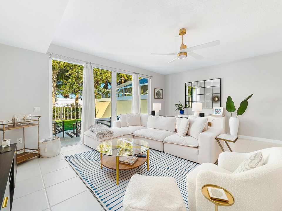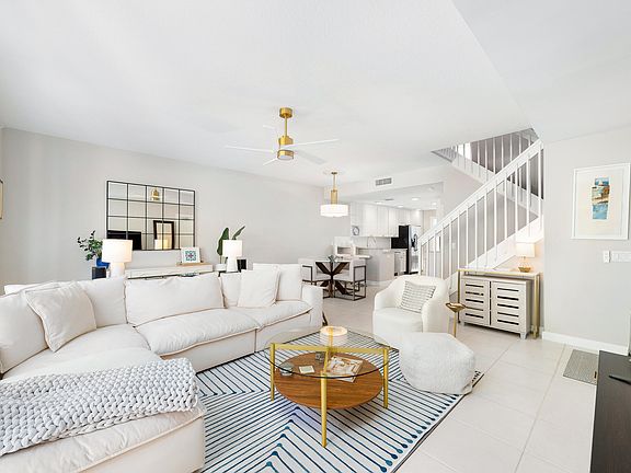 Nestled in central Palm Beach Gardens, this beautifully updated townhome is located in the desirable, DiVosta-built community of Catalina Lakes. Perfectly situated within a short distance to community amenities, yet tucked away from the entrance, this 3-bedroom, 2.5-bath home offers a spacious and comfortable living space. An exclusive hedge-lined walkway and open green space adjacent to the home further enhances privacy. Enjoy modern upgrades throughout, including fresh exterior paint (2024), upgraded finishes, and Smart Home features such as a Wi-Fi-controlled garage door opener, front door lock, and HVAC system. The bright and open main floor boasts white tile flooring, complemented by luxury vinyl plank (LVP) flooring on the stairs and second floor. The split-bedroom layout includes a serene primary suite overlooking green space, offering a tranquil retreat. Adjacent guest parking, two well maintained tennis courts, and direct access to trails enhance the convenience of this home. Upgrades include a new roof (2024), water heater (2023), washer/dryer (2023), and dishwasher (2023), along with a new fence (2024), landscaping, and stylish new lighting and fans in a modern white and gold finish. Catalina Lakes offers residents access to a pool, tennis courts, and a tot lot, all within a friendly community atmosphere. Minutes from world-class shopping, professional golf events, a variety of dining options, and major highways, this home is your gateway to everything Palm Beach Gardens has to offer.