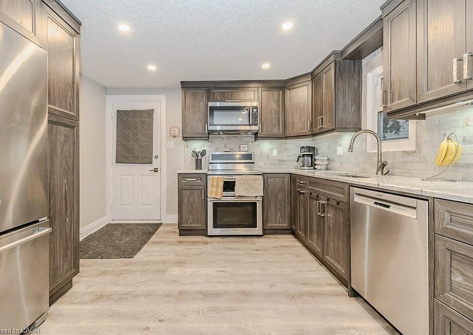 Nestled in the desirable Preston Heights neighbourhood, this beautifully renovated 2-storey family home offers modern elegance with exceptional functionality, all in a location just steps from parks, schools, and scenic trails. Completely updated from top to bottom in 2019, the home boasts a bright and inviting living room that is flooded with natural light from large windows, and an eat-in kitchen showcasing custom cabinetry, quartz countertops, modern appliances, a pantry cupboard, and a charming dinette area with custom, built-in bench seating and hidden storage. Upstairs, four comfortable bedrooms and a tastefully updated 4-piece bathroom offer an ideal retreat for the whole family. The finished basement extends the living space with a spacious recreation room, a 3-piece bathroom, laundry facilities, and ample storage space. Step outside to enjoy a fully fenced yard complete with mature trees, a large workshop, deck, and gazebo area- perfect for outdoor entertaining or hobbies. Parking for three vehicles ensures plenty of room for family and guests. With its prime location and easy access to Hwy 401, this move-in-ready home is an exceptional choice for commuters or those seeking comfort, style, and convenience.