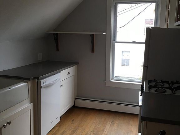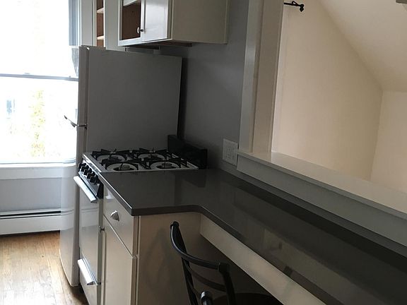 This lovely studio apartment is located on the second floor and has hardwood floors throughout. The bathroom is spacious and has a claw foot tub and shower hook-up. The kitchen is separate from the living space, it includes a farm sink, gas range, dishwasher, quartz countertops, new cabinets and open shelving. There are new windows in the unit and seasonal lake views to enjoy.