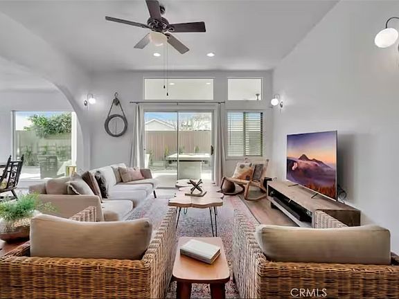 Outdoors, experience true resort-style living. Enjoy a sparkling saltwater pool and spa with a Baja lounge shelf, challenge friends to a game of pool, or unwind by the fire pit under the stars. The backyard also features a barbecue area, lounge seating, and a spacious grass lawn for games or sunbathing.